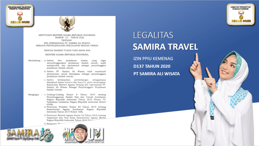SAMIRA TRAVEL merupakan perusahaan Travel Haji dan Umroh Terbaik di Indonesia. Kini telah berdiri (9+) TahunIzin Umroh PPIU Kemenag RI –> Cek disini